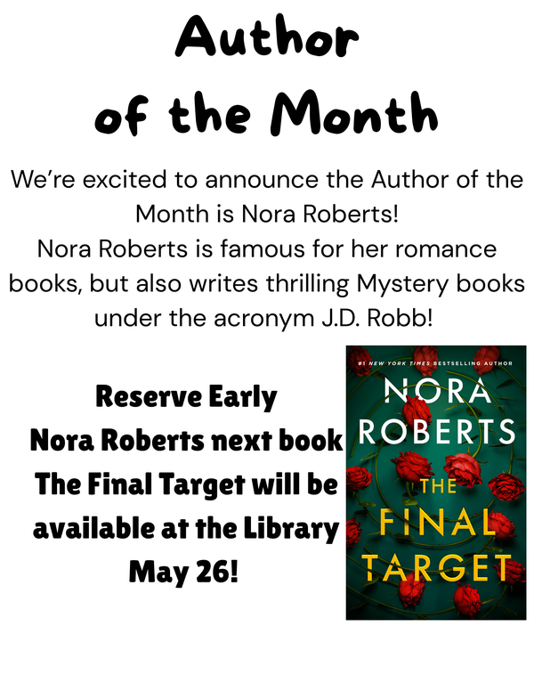 Introducing Author of the Month to the Library! For the Month of March the Author of the Month is Nora Roberts, who is famous for her Romance books, and her Mystery Books under the acronym J.D. Robb!
